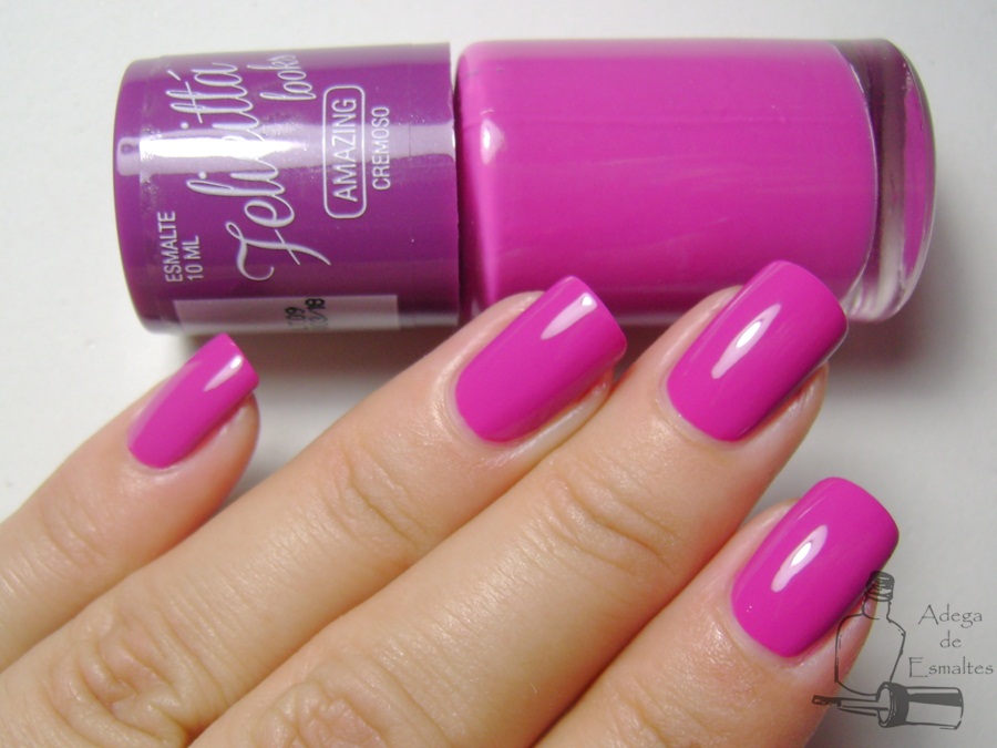 Hoje escolhi usar o Amazing. Ele é pink cremoso. Um tom mais fechado do que nas fotos, mas é um dos pinks mais lindos que eu já vi. E a cobertura é excelente. Uma camada já deu conta. Aquela velha história de passar duas pra deixar as fotos bonitas aconteceu kkkk... Então, está com duas camadas.