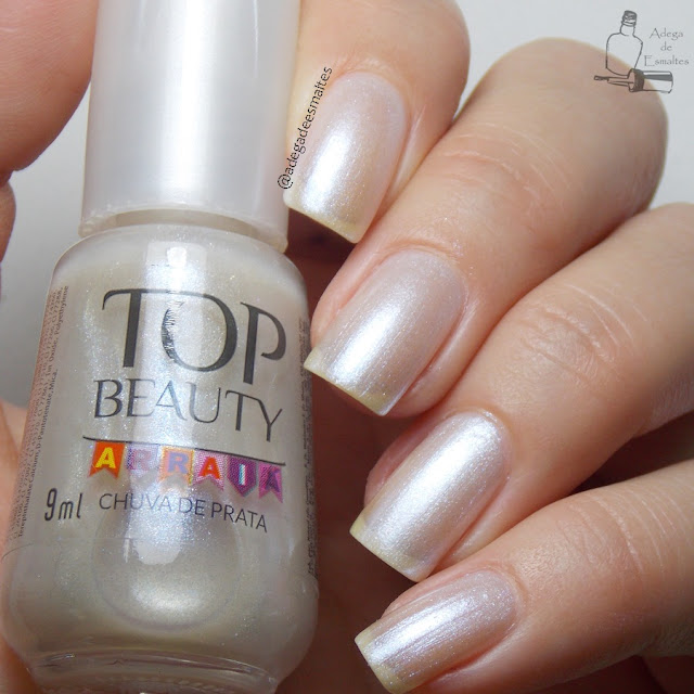 Chuva de Prata: Este o branquinho, na verdade nem branco é, ele é transparente, tipo um renda, com shimmer azulado. Passei 3 camadas e ainda assim não cobriu o branquinho das unhas, então eu acho que ele deve ser usado com outro esmalte de base. Também deve ficar lindo pra fazer um sanduíche com um branquinho transparente né... hummm... #ficaadica